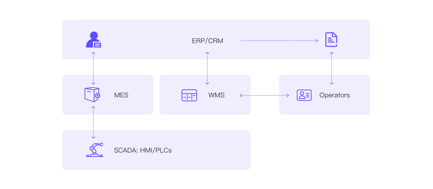In Industry 3.0, there is typically an ERP or CRM system in control of the organization and the manufacturing plant. It coordinates with a warehouse management system (WMS), taking production orders from operators and dispatch schedules, bills of materials (BOMs), and work orders down to the plant floor. The manufacturing plant reports back to the central office and operators via spreadsheets. The data is not real-time, meaning it cannot accurately reflect the current business state.