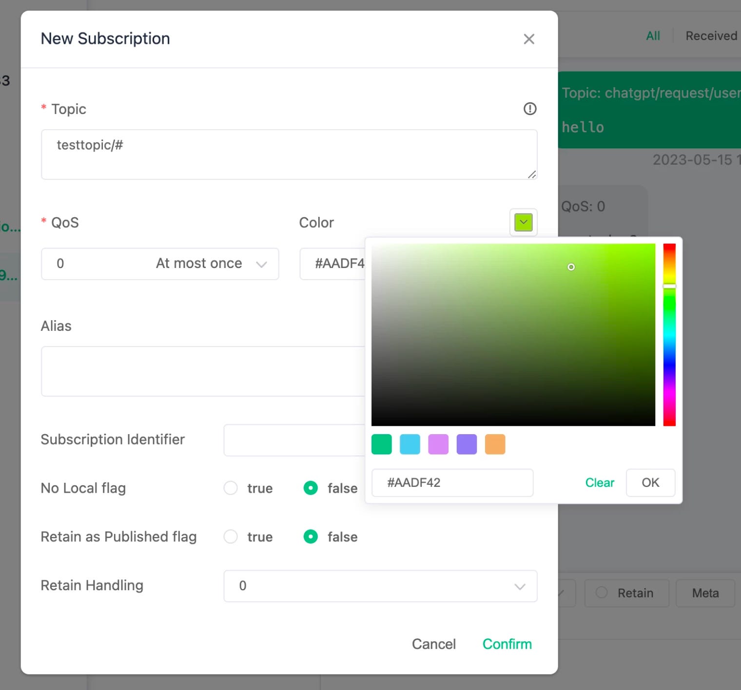 Furthermore, MQTTX allows you to customize the color for each subscription, giving you complete control over the appearance of your MQTT subscriptions.