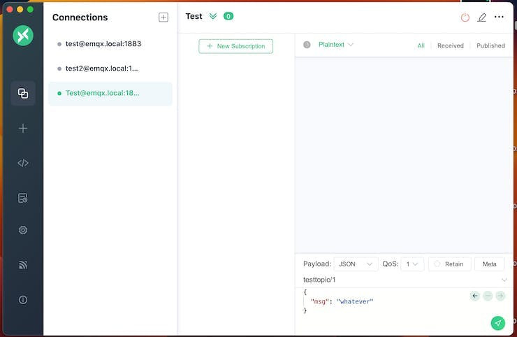 To subscribe to a message, click on New subscription and supply the topic you'd like to subscribe to. Any message published to that topic will appear in the window for that connection. Try this out by creating a new user, a new connection, and subscribe to a topic that the other connection is publishing to.