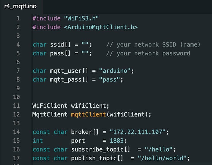 }At the top of the sketch configure your WiFi credentials, the user credentials from your EMQX broker, the IP address of where your broker is running, and the topics you would like to use.