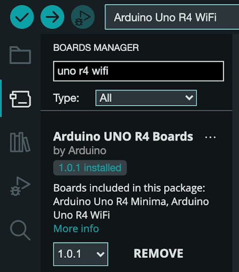 Install the Arduino Uno R4 WiFi Board by searching it from the Boards Manager.