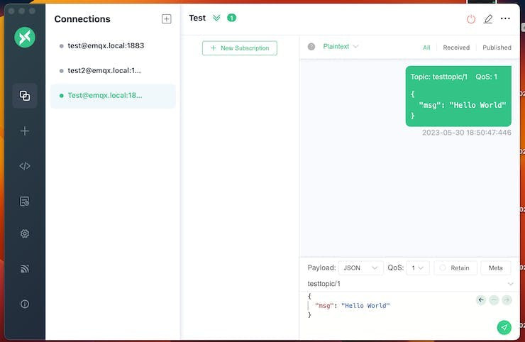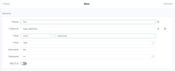 MQTTX is a free tool that helps you test client connections to an MQTT broker. It also lets you publish and subscribe to topics. We'll use it to connect to the EMQX broker running using the user credentials created earlier.